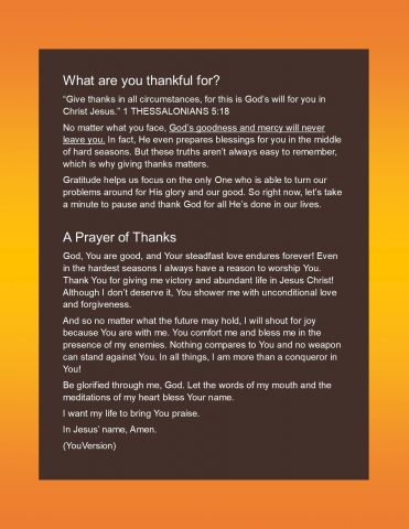 At Thanksgiving we are thankful for our food, but we are grateful for so much more than that. Why not take a few moments at your Thanksgiving table this year to recognize the other blessings in your life as well? Here’s a short devotional and simple worksheet to help you do this. Happy Thanksgiving!