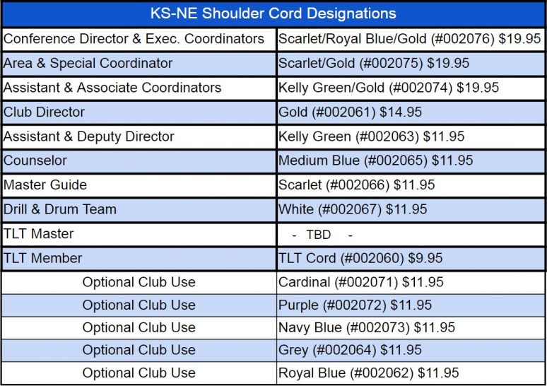 Cords should be worn on the left shoulder. Cords should consist of a main braided cord, two outside shoulder loops without ornamentation, and one gold pencil device. (Exception: TLT cord.)