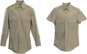 Tan long sleeve or short sleeve shirt with two pleated patch pockets with flaps on the chest and shoulder epaulets.
