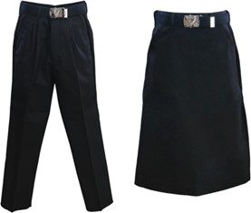 Skort – Black, belt loops, hem should be at mid-knee or below.