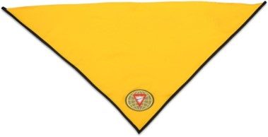 TLT’s - Yellow Pathfinder Neckerchief with red trim stitching and the Pathfinder World logo. The neckerchief is secured with the black fabric Pathfinder Slide.